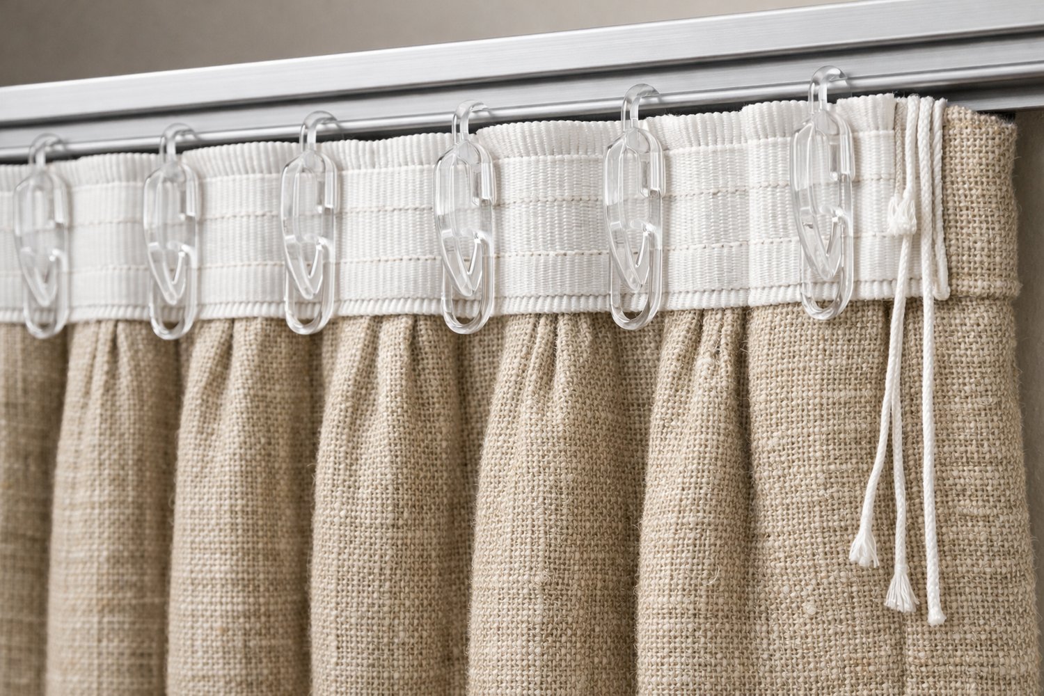 Шторная лента пришивается по верхнему краю ткани и крепится к карнизу с помощью крючков. Она создаёт классические, равномерно распределённые складки. Крепление на ленте универсально — подходит для большинства карнизов и позволяет регулировать пышность шторы.